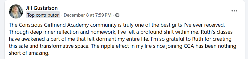 "I found my home in Conscious Girlfriend. I was in a deep dark depression, and through the Elders group, I accepted myself and came alive again."Ā Ā Ā