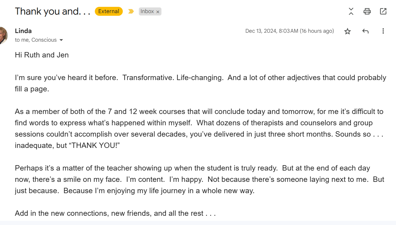 KN writes: "Although I wasnāt able to join live, I listened to all the classes, and realized that Anxious Attachment had my name all over it plus some Avoidant Attachment, too. And my girlfriend, too. We broke up, but now we realize we actually both kept sabotaging, and itās brought us so close! We are both so happy and excited, and taking our time getting to know each other, talking and communicating like never before.Ā My heart is full! I canāt thank you enough!!"